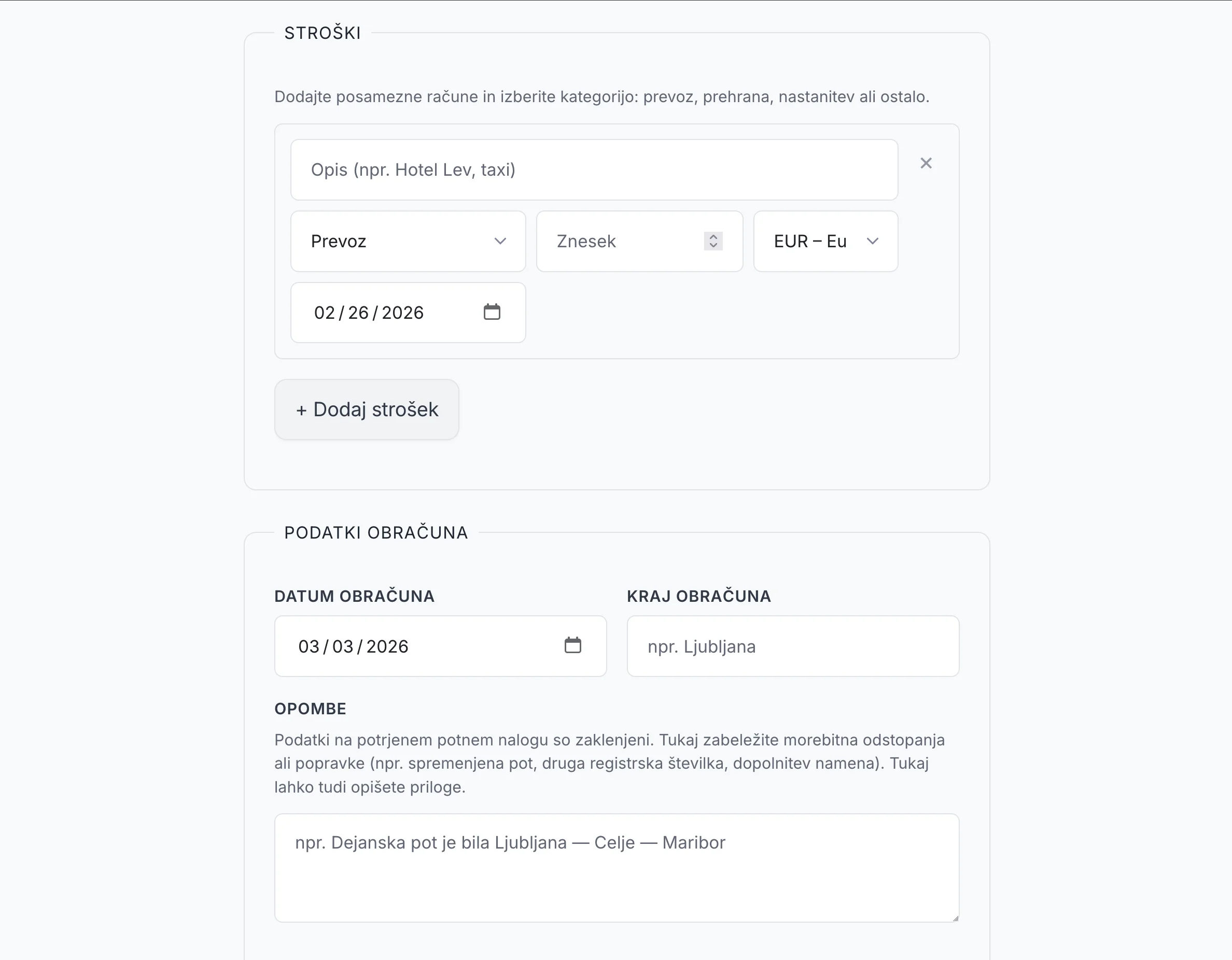 Obračun dnevnic, kilometrine in potnih stroškov — zakonsko skladen, pripravljen na FURS. Od vnosa do PDF dokumenta v nekaj klikih.