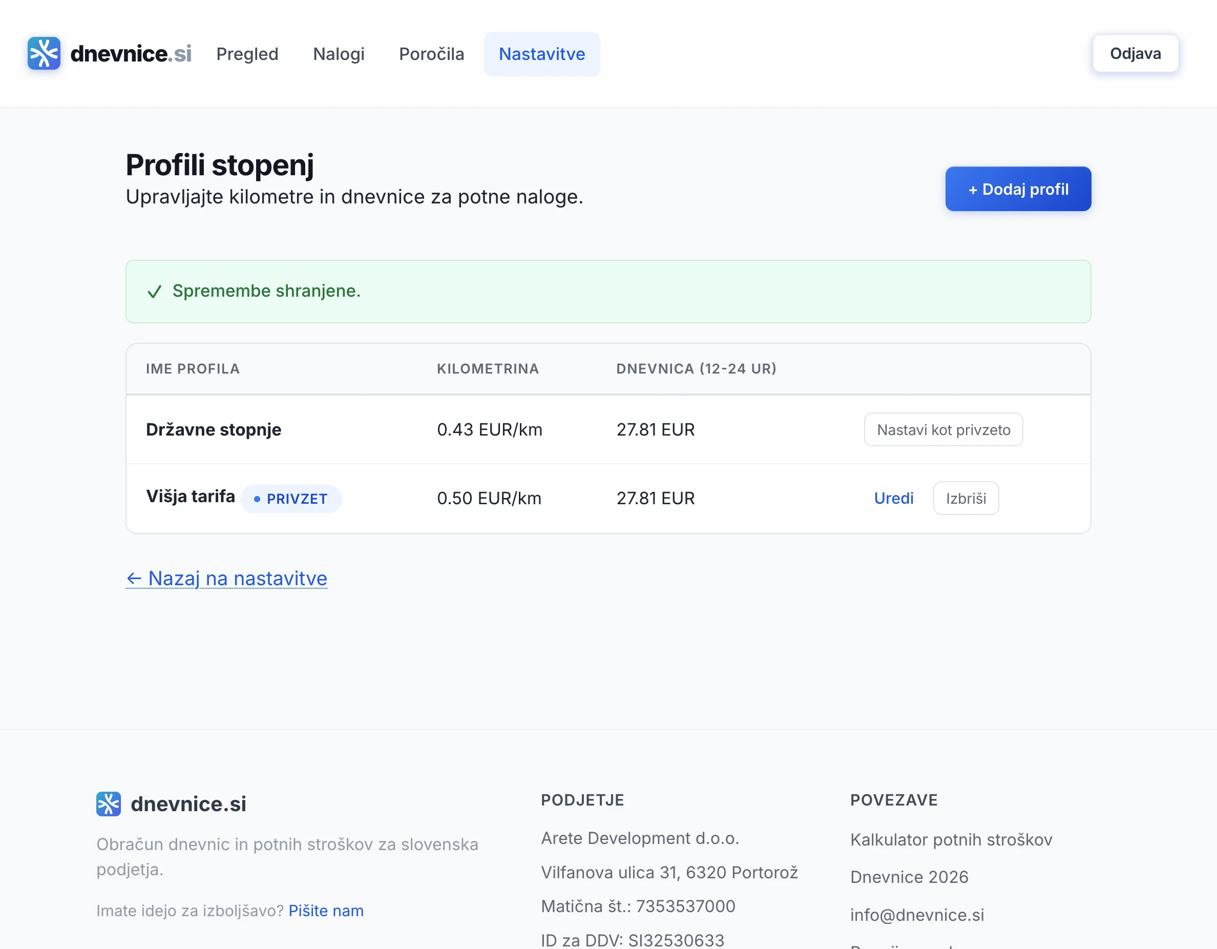 Da. Sistem izračuna dnevnice in kilometrino v skladu z Uredbo o davčni obravnavi povračil stroškov in Zakonom o dohodnini (ZDoh-2). Zneski se posodabljajo ob zakonskih spremembah.