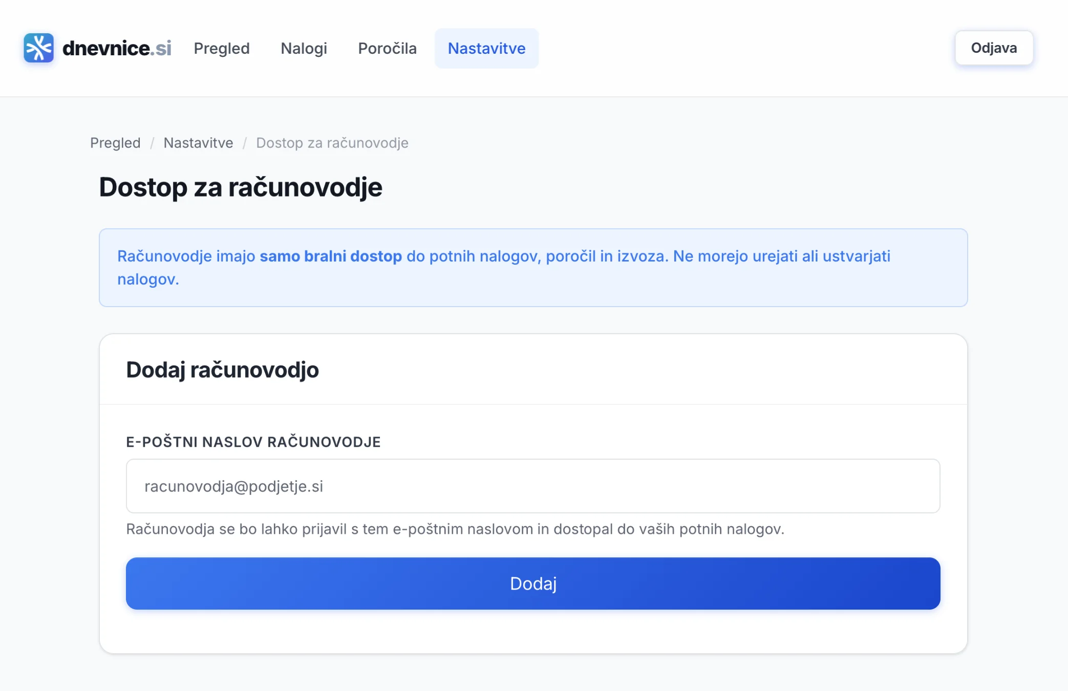 Da. V nastavitvah dodajte e-naslov vašega računovodje. Računovodja dobi brezplačen vpogled v vse potne naloge, poročila in izvoze — brez možnosti urejanja ali dodatnih stroškov.