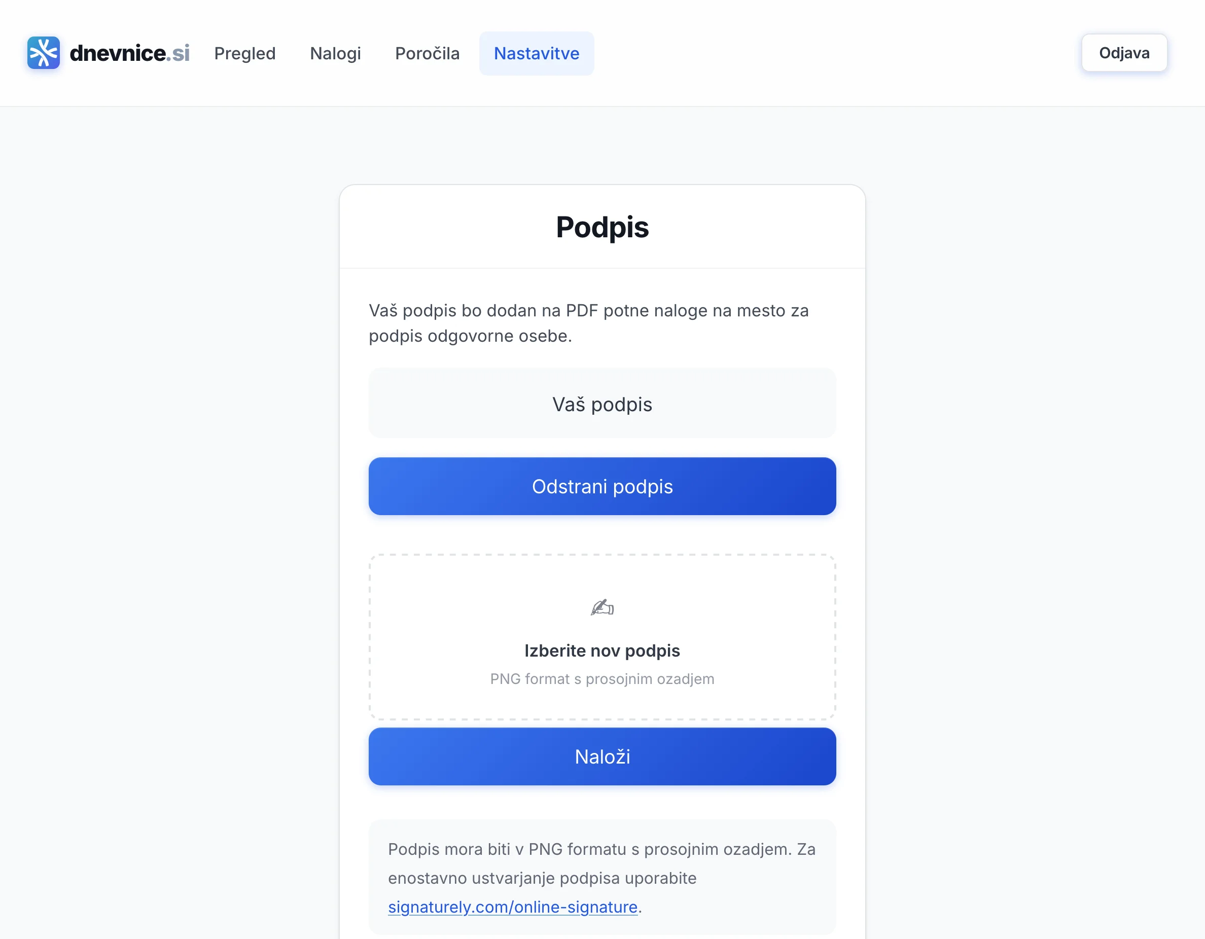 Da. Ko ustvarite potni nalog, zaposleni prejme e-poštno obvestilo. S klikom na povezavo se prijavi, naloži svoj podpis in podpiše nalog — brez papirja ali posredovanja administratorja.