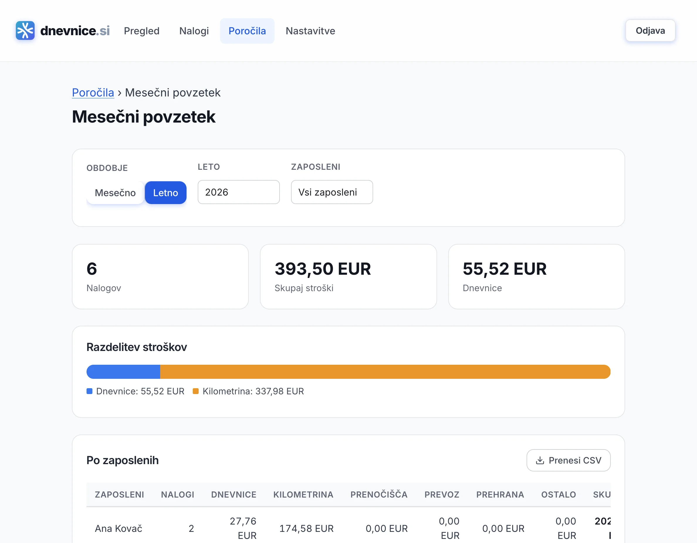 Mesečna naročnina znaša 15 €/mesec + DDV, letna pa 99 €/leto + DDV (le 8,25 €/mesec). Začnete z brezplačnim 14-dnevnim preizkusom — brez kreditne kartice. Oba paketa vključujeta neomejeno zaposlenih, neomejene potne naloge, PDF izvoz, več uporabnikov in prednostno podporo. Brez skritih stroškov, brez vezave.